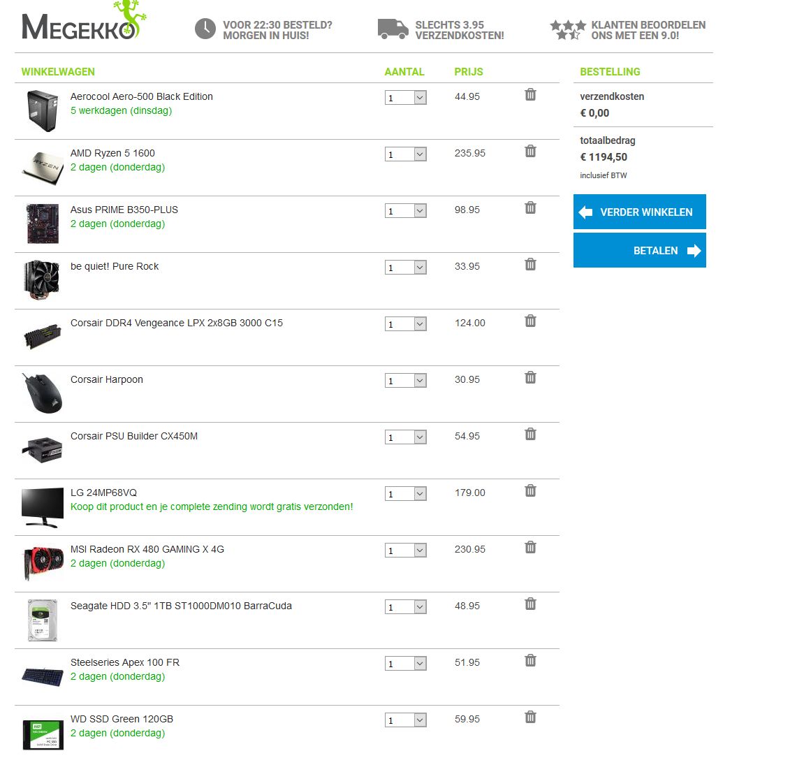 Doordat 24" scherm vallen je verzendingskosten weg. Ik heb die gekozen omdat dat scherm een FreeSync optie heeft waar die AMD GPU een serieus voordeel uit kan halen in-game.Last edited by Ascari; 11-04-2017 at 18:12.