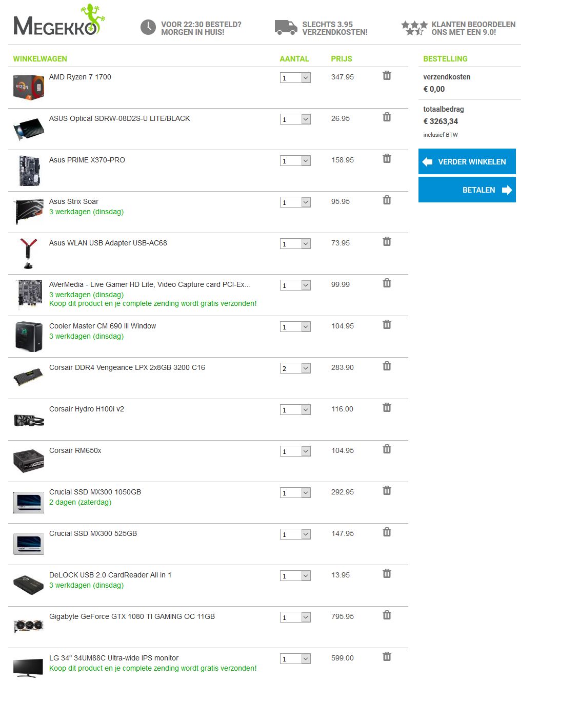 Heb een aantal kleine aanpassingen gedaan, nl. een Ryzen CPU en mobo combo met bijpassend DDR4-3200 geheugen gekozen, een GTX1080Ti, een lager wattage voeding en een 34" met 3440x1440 gekozen. Zo bespaar je ±€200 dat je helemaal niet hoeft uit te geven.