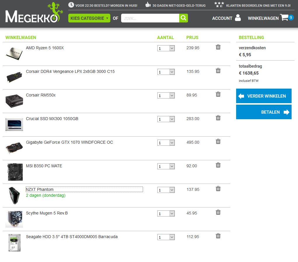 Heb een aangepaste build gemaakt, weliswaar bij megekko.nl, omdat de prijzen en de verzendkosten toch wat goedkoper zijn. BIj megekko €1638,65 (incl. verzending) en bij azerty €1722,72 (excl. verzending en verwerkingskosten).