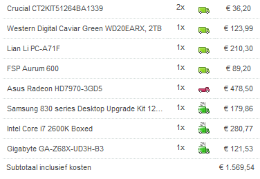 Ik zou toch willen gaan voor een HD 7970 van Sapphire, een I7 2600K, 16GB ram, een Intel SSD.