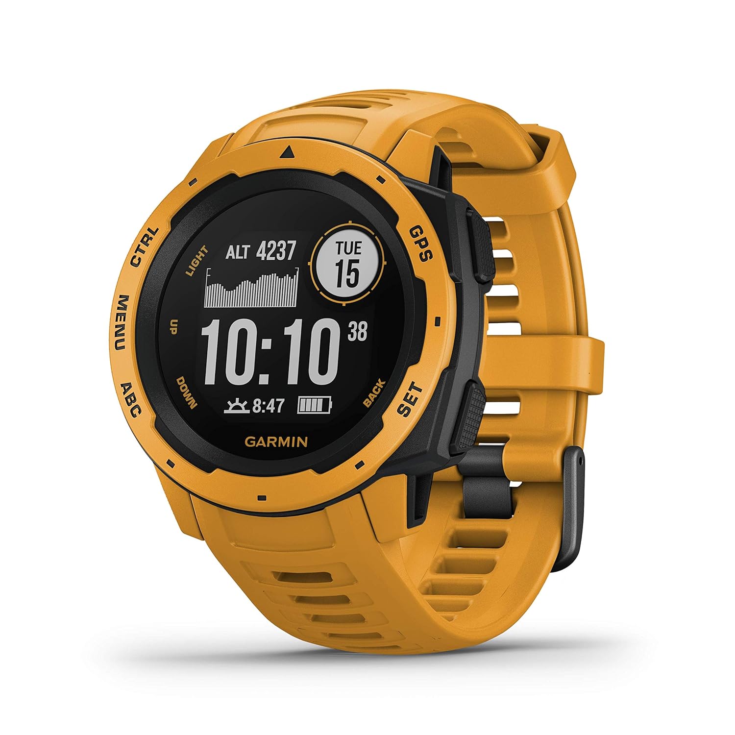 En de Garmin Instinct smartwatch in Sunburst Yellow