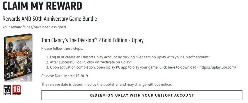 volgens ubisoft support site https://support.ubi.com/en-us/Faqs/0...Division-2-TD2 heb je wel degelijk een AMD product nodig .. " Note that, in order for the redemption process to complete successfully, you might be required to have the AMD product you purchased installed on your machine. "