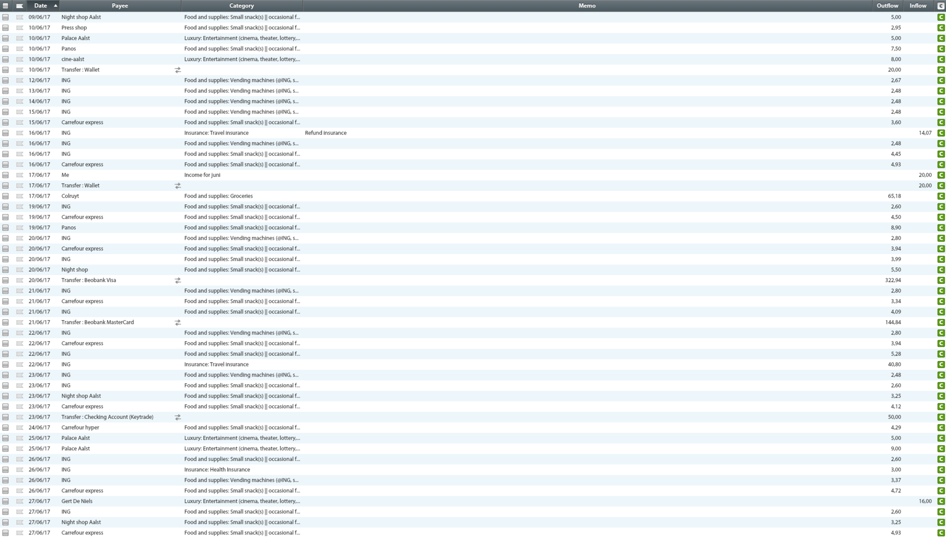 - Wat te doen met cash transacties? Ik had een categorie cash, en soms wist ik nog wanneer ik in een supermarkt ofzo ne cashback gevraagd had maar zeker niet altijd. En al zeker niet tot op de € waar mijn cash naartoe ging. In grote lijnen wel natuurlijk.