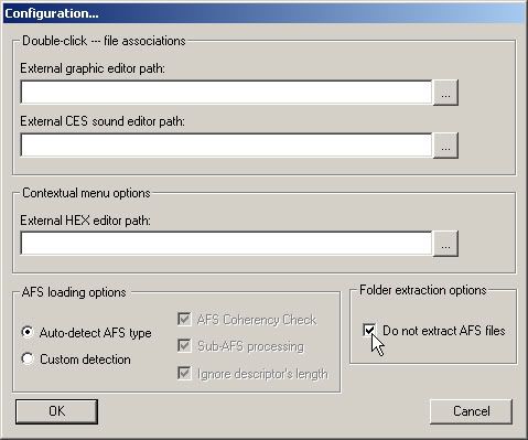 - Zet onder "AFS loading options" AUTO-DETECT AFS TYPE" aan en vink "Do not extract AFS files" aan