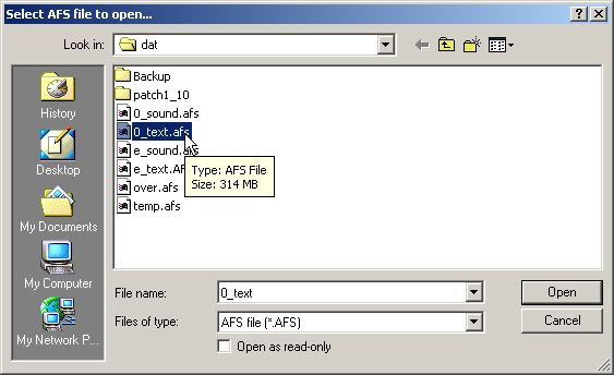 - Ga naar de installatiemap van PES 4 dan naar de map "dat" en kies '0_text.afs' (negeer foutberichten)