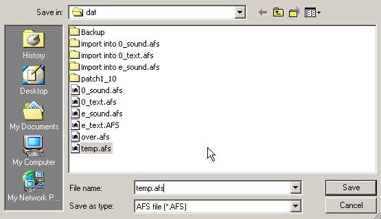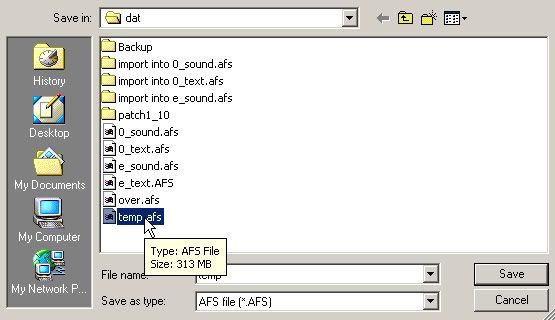- Kies als naam "temp.afs" (tijdelijk bestand) en "OK" (schrijf over)