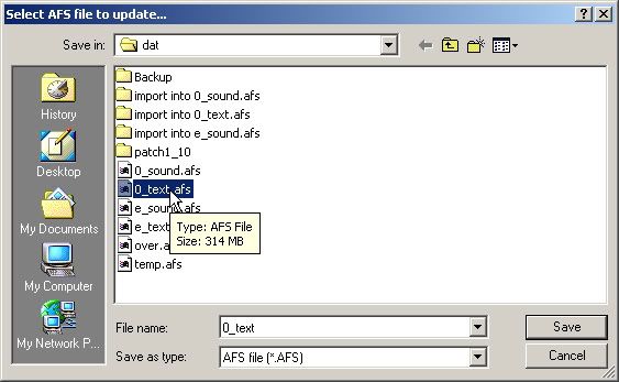 - Kies "File" -> "Update" en sla nog eens op als "0_text.afs" (kies ja om te overschrijven)
