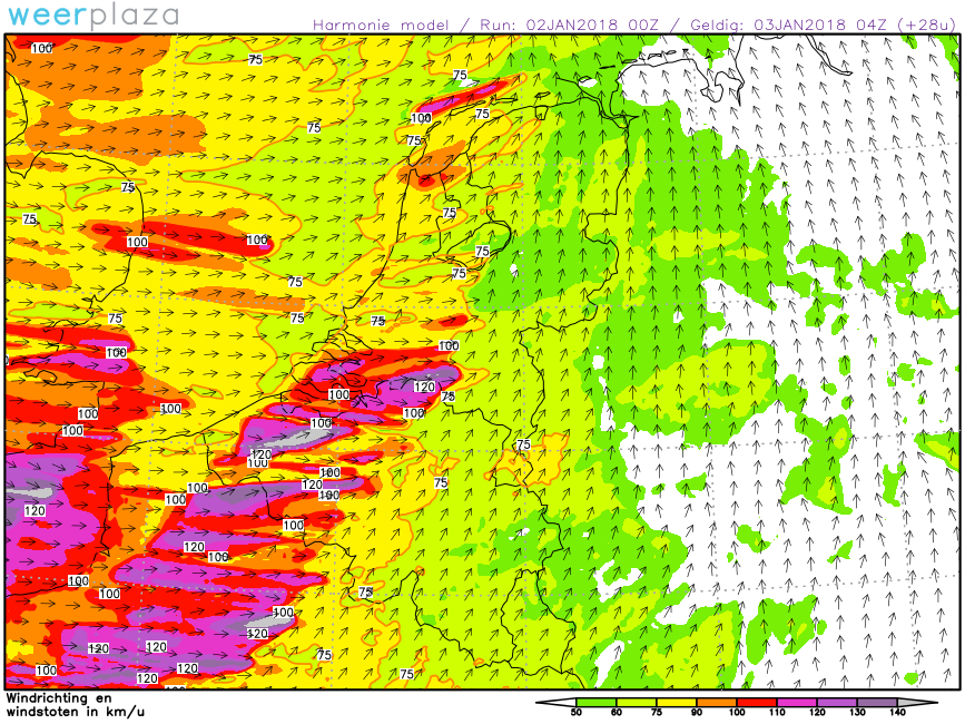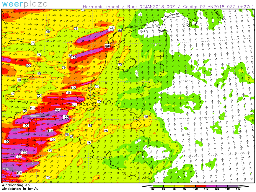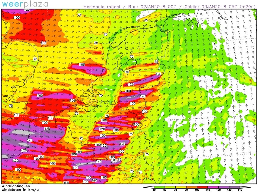 Voor vannacht windstoten die kunnen oplopen tot 140 km/u. Zeer gevaarlijke situatie!