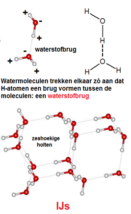 Het is dus inderdaad zo dat door de ruimtelijke ordening van watermoleculen met waterstofbruggen er meer ruimte tussen de moleculen zit. Waarom dit dan nog zo veel verschilt bij water en ijs ligt aan het volgende: