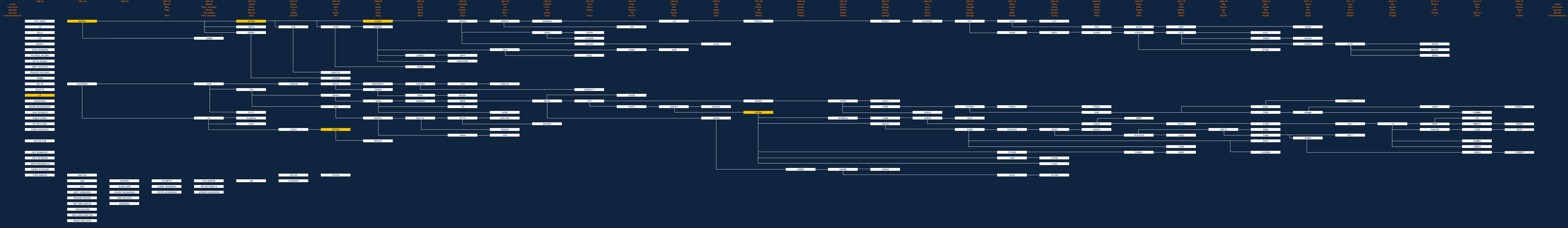 Hetgeen waar de meeste schema-programma's moeite mee hadden, is dat soms de verbindingen meerdere 'stappen' overslaan. In dit geval kan dus een verbinding tussen twee clubleden zich uitstrekken over meerdere jaren. Terwijl in de schema-programmatuur de verbindingen slechts één 'stap' of 'sprong' kan bestrijken.no votes