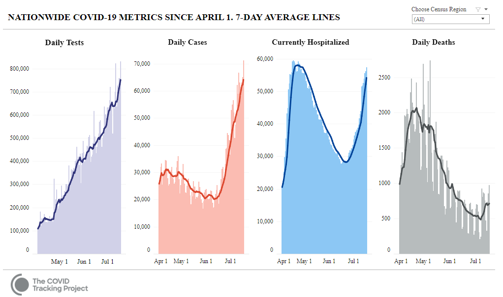 Over de hele USA is het dodental weer aan een opwaartse trend bezig, misschien nog niet catastrofaal snel, maar het 7-daagse gemiddelde is toch al bijna 50% gestegen op een dikke week, van 484 op 6/7/2020 naar 712 gisteren.