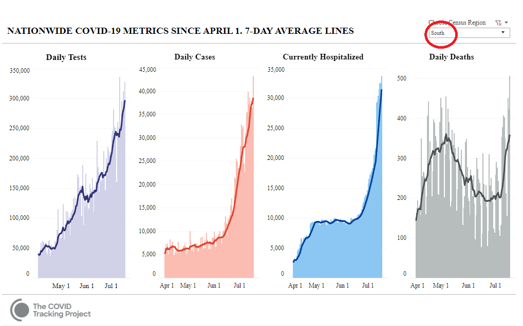 Neem je dan enkel het zuidelijk gedeelte van de VS, daar is het wel rampzalig! Daar is het 7-daags gemiddelde met bijna 90% gestegen sinds het laagste punt na de piek, van 192 op 20/6/2020 naar 358 gisteren.