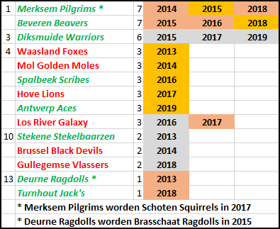 Van de originele 16 ploegen blijven er nog 5 over: Brasschaat Ragdolls (tot 2015 Deurne Ragdolls), Diksmuide Warriors, Spalbeek Scribes en Schoten Squirrels (tot 2017 Merksem Pilgrims) hebben tot hiertoe elk seizoen gespeeld. Stekene Stekelbaarzen was er 3 seizoenen tussenuit, maar sloot opnieuw aan in 2018.